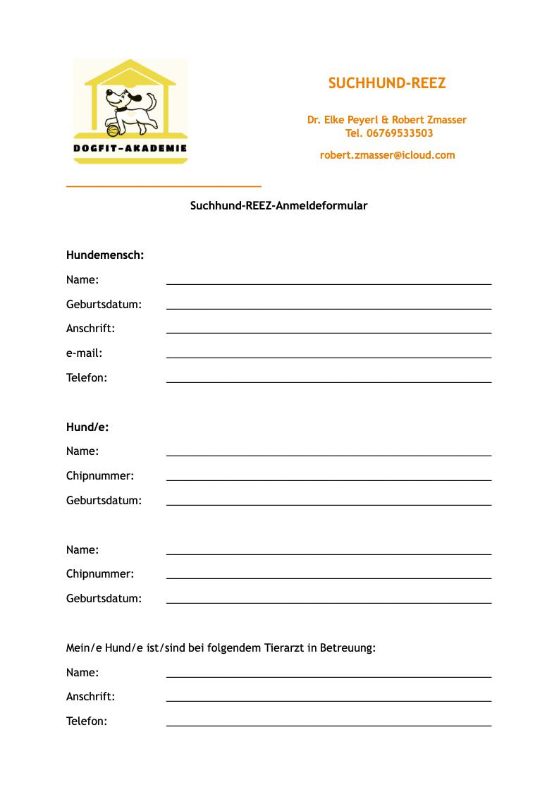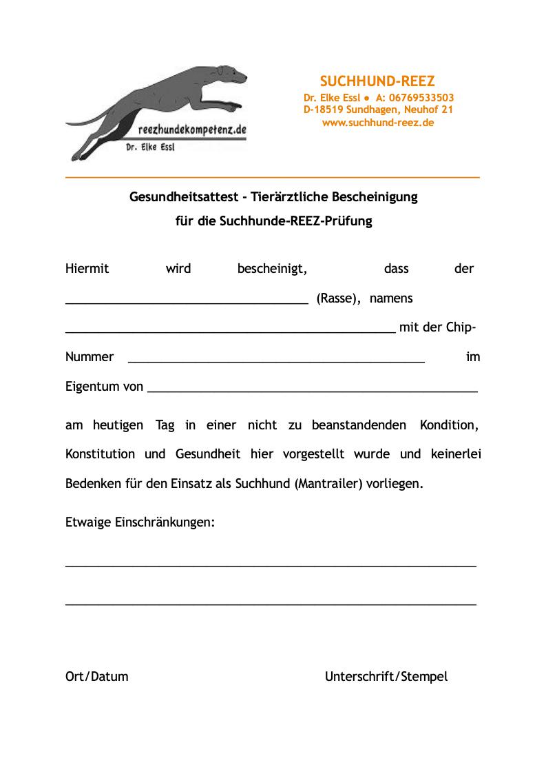 Das Anmeldeformular muss nur dann ausgefüllt werden, wenn man über den Verband REEZ-Suchhund offizielle Prüfungen ablegen möchte. In diesem Fall ist ein jährlicher Mitgliedsbeitrag zu entrichten. Zudem muss vor Antritt einer Prüfung jährlich ein Gesundheitsattest des Hundes vorgelegt werden. Beide Formulare befinden sich anbei. Nähere Infos bitte unbedingt bei mir, deiner Mantrailing-Instruktorin, erfragen. Danke.